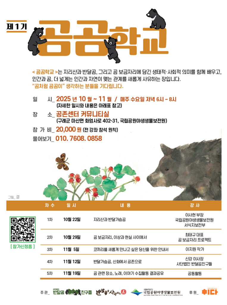 반달곰의 삶과 복원 이야기, 곰 보금자리를 통해, 우리는 인간 중심의 시선을 넘어 공존의 길을 모색할 수 있습니다. <곰곰학교>는 강의만 듣는 공간이 아니라, 이야기를 나누고 서로의 경험을 공유하며 “곰처럼 곰곰이” 생각하는 학교가 되고자 합니다. 관심 있는 분들의 적극적인 참여를 부탁드립니다.
