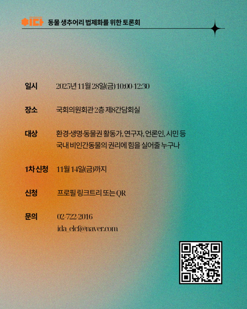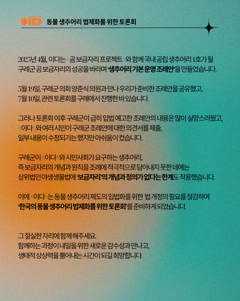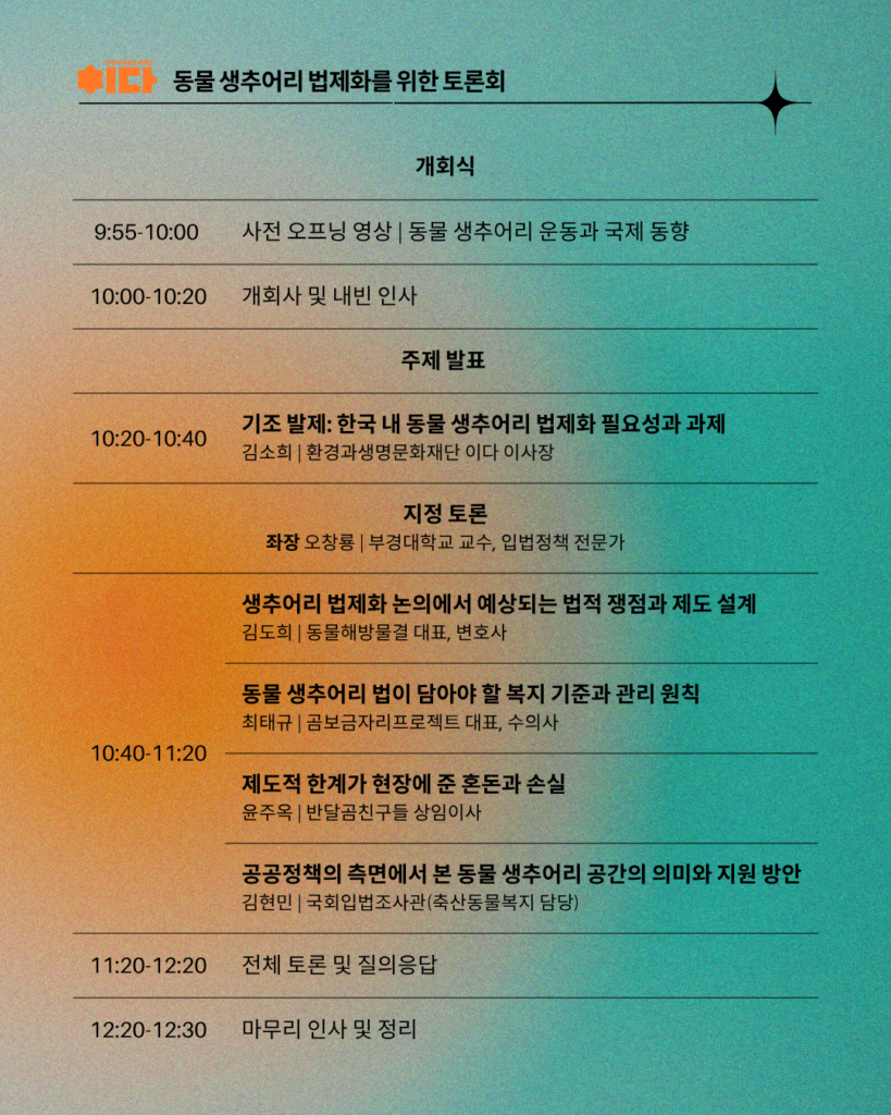 2025 동물 생추어리 법제화를 위한 토론회 게시자 : 반달곰친구들 | 2025-11-20 | 공지사항 | 0 2025 동물 생추어리 법제화를 위한 토론회 일시: 2025년 11월28일 금요일 오전 10시~12시30분 장소: 국회 8간담회실 주최: 환경과생명문화재단 이다 / 김태선 의원실 / 국회동물복지포럼 / 곰보금자리프로젝트 / 동물해방물결 후원: 바보의재단