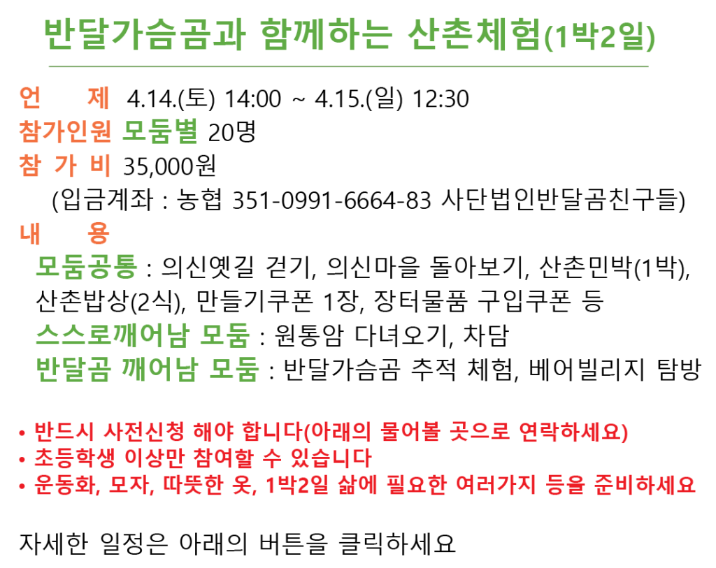 | 14시~15시30분 | 스스로 깨어남 모둠 : 원통암 다녀오기 반달곰 깨어남 모둠 : 반달가슴곰 추적, 베어빌리지 답사, 반달곰 만나기 |